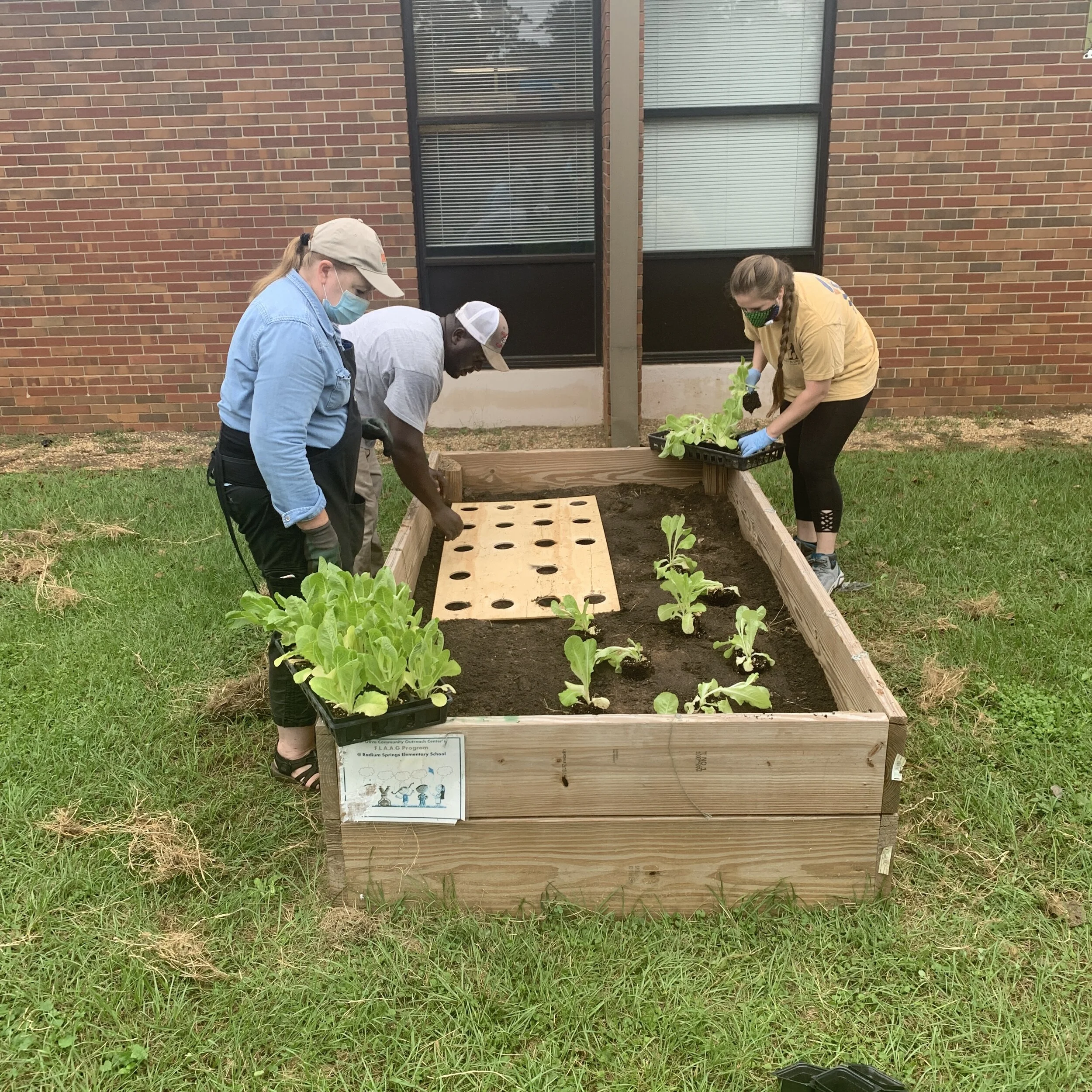 Fredando Jackson (Executive Director of FRF), Jordan Parker (School Garden Coordinator), and Kristen Caso (DOCO Schools Nutrition Partner of Excellence) planting romaine lettuce at Radium Springs Elementary School.